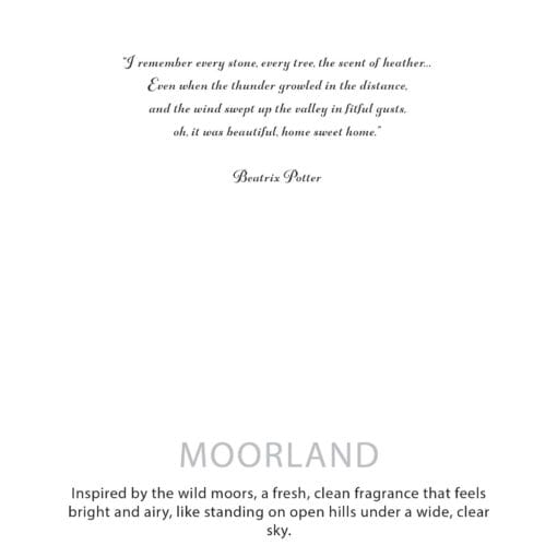 Inspired by the wide, open moors of the Lake District, Moorland is a fresh, clean fragrance that feels light and expansive. It captures the sensation of standing on open hills under a clear sky, with cool air and space all around you.