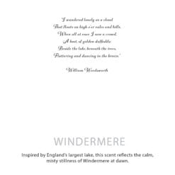 Inspired by England’s largest lake, Windermere captures the calm, misty stillness of early mornings by the water. The scent feels clean and soothing, with soft florals and gentle freshness that bring a sense of space and quiet into the room.